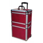 - section case with wheels and many storage compartments: upper section with extendable trays, middle and lower section with flexible partitions